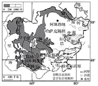 中亚水资源缺乏且分布极不平衡。哈萨克斯坦的巴尔喀什湖西部有河流注入,含盐量较低;湖泊东部无大河注入,蒸发量大于补给量,含盐量较高,形成独具特色的西淡东咸、“一湖两水”现象。下图示意中亚地形。据此完成下面小题。