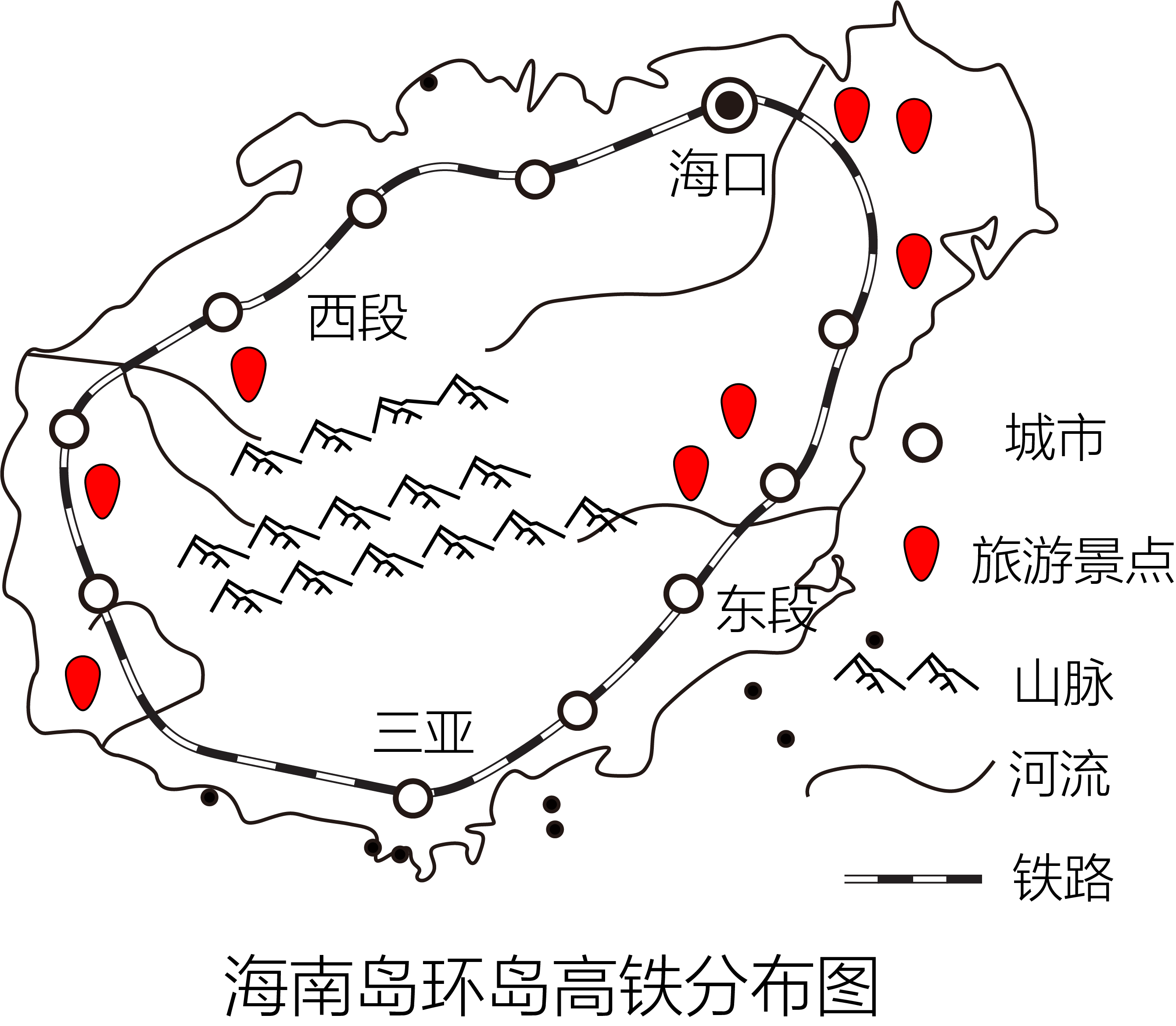 海南岛是我国第二大岛屿,美丽富饶,景色迷人。2015年12月30日海南环岛高铁全线开始运营,形成了“环岛三小时交通圈”,游客乘高铁环游海南岛成为现实。读图,完成下面小题。