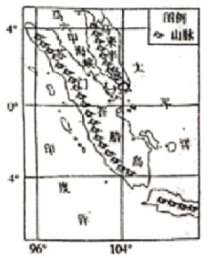 印度尼西亚的苏门答腊岛是一座物种丰富的热带岛屿,该岛西半部山脉众多,贯穿全岛。该岛植被多为热带雨林,岛上有三座国家公园,是名副其实的生物宝库。下图为苏门答腊岛简图。读图完成下面小题。
