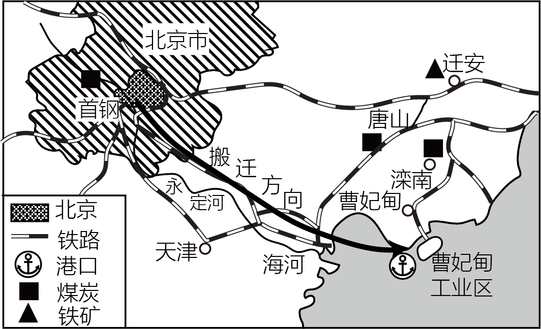 为改善城市环境,北京把大型钢铁企业“首钢”迁往河北省的曾妃甸工业区。作为我国首个“循环经济”示范区,该工业区力求最大限度地利用工业废物创造新的资源,以降低环境污染。读图,完成下面小题。