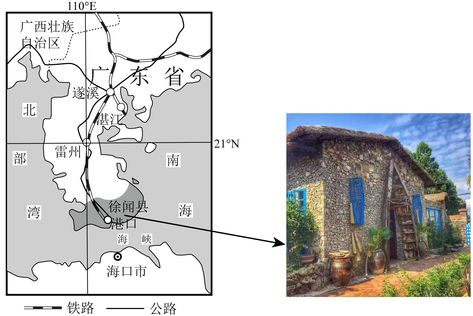 "珊瑚屋"是用珊瑚当墙,茅草搭盖而成。数百年以来,广东省徐闻县海边居民采珊瑚石,作为建筑材料,建造了大量的"珊瑚屋"。目前有关专家学者呼吁对现存"珊瑚屋"进行开发性保护。图1为徐闻县地理位置示意图,图2为"珊瑚屋"景观图。据此完成下面小题。【乡土地理+民居与环境主题】