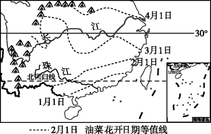 油菜花开金色灿烂,美不胜收;桃李满坡,果香四溢。一些南方山村利用“赏花品果”建设乡村生态旅游模式,走上了致富路。读中国南方地区油菜花开日期等值线图,完成下面小题。