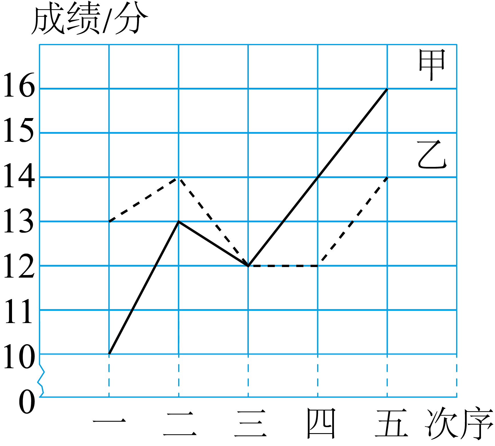 甲、乙两人参加某体育项目训练,为了便于成绩分析,把最近五次训练的成绩分别用实线和虚线连接(如图),下面结论错误的是(