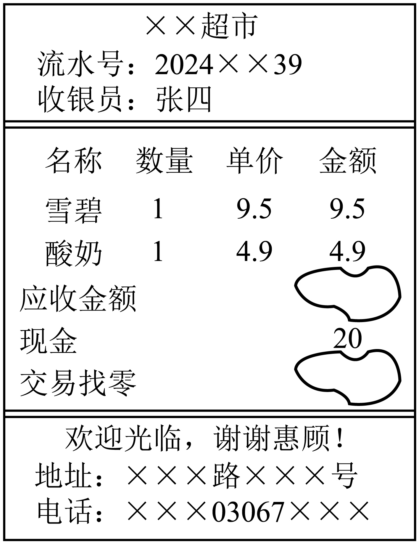 妈妈在购物后不小心把小票弄脏了,请你仔细看一看,算一算。